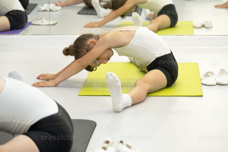 Ребенок занимается в танцевальной студии в зале на мате, делает упражнения на растяжку и пресс, садится на шпагат. Работа над собой и своим телом с детства, преодоление себя