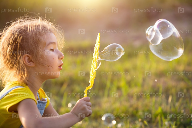Девушка в джинсовом комбинезоне пускает мыльные пузыри летом в поле на закате. Международный день защиты детей, счастливый ребенок, мероприятия на свежем воздухе. Летний фон. Здоровый и экологичный образ жизни