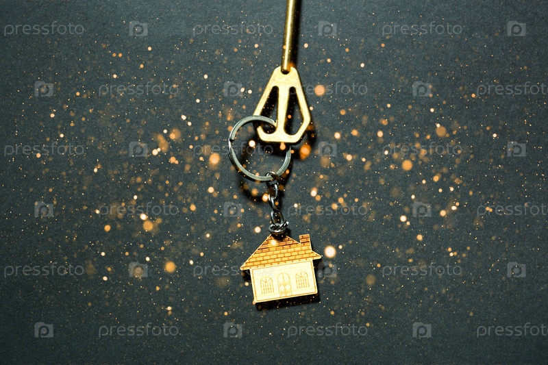 Ключ от дома с золотыми блестками и свечением на черном фоне. Строительство, дизайн, проект, переезд в новый дом, ипотека, бронирование, аренда и покупка недвижимости. Новый год, Рождество