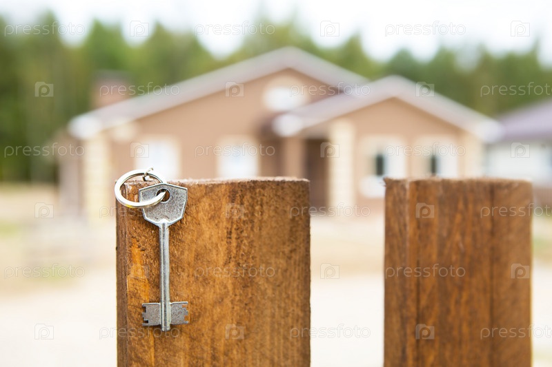 Ключ от дома висит на деревянном заборе на фоне коттеджей. Строительство, дизайн, проект, переезд в новый дом, ипотека, аренда и покупка недвижимости. Копировать пространство
