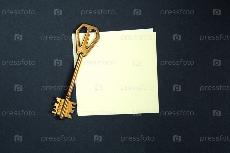Золотой ключ на листе бумаги для заметок. Список пожеланий, решение проблем, идея, расшифровка, бизнес-концепция на черном фоне с квадратным листом. Проект, аренда, бронирование, домашние дела. Копировать пространство