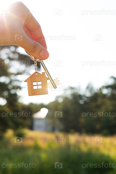 Деревянная подвеска дома и ключ. Фон сельской местности, природа. Мечта о доме, строительство, сдача проекта, переезд в новый дом, ипотека, аренда и покупка недвижимости. Копировать пространство