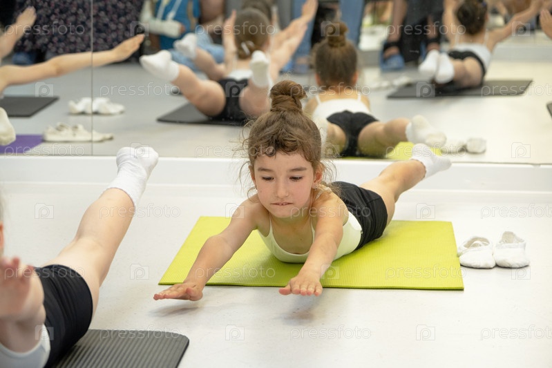 Ребенок занимается в тренажерном зале на коврике, делает упражнения на растяжку и пресс, гимнастику и общефизическую спортивную подготовку. Работа над собой и своим телом с детства, преодоление себя
