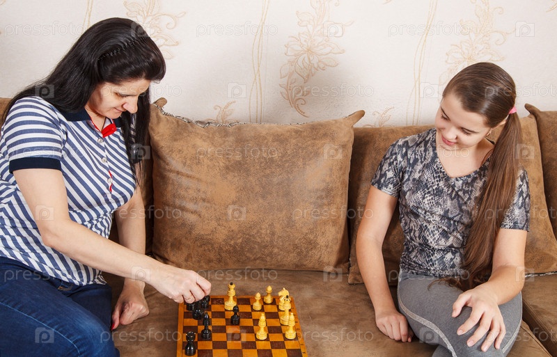 Мама и дочка играют в шахматы дома
