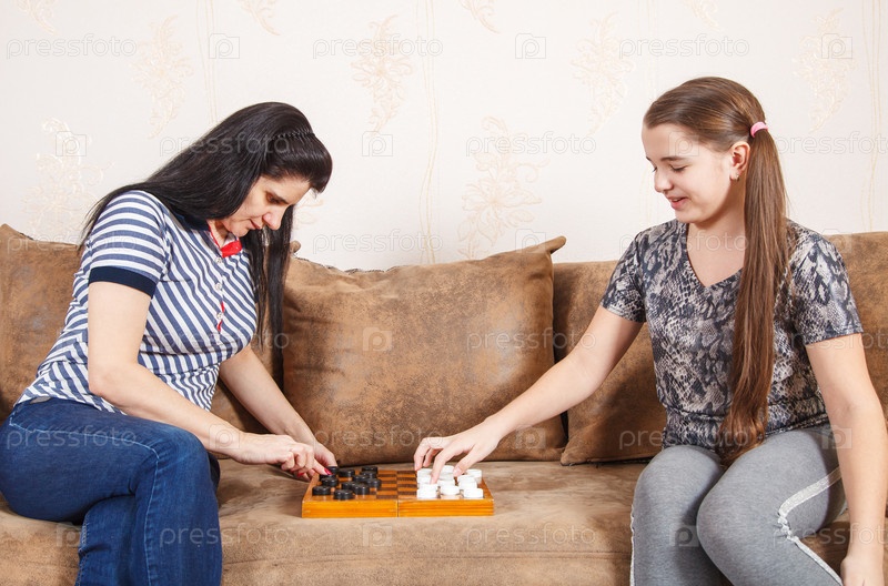 Мама и дочка играют дома в шашки