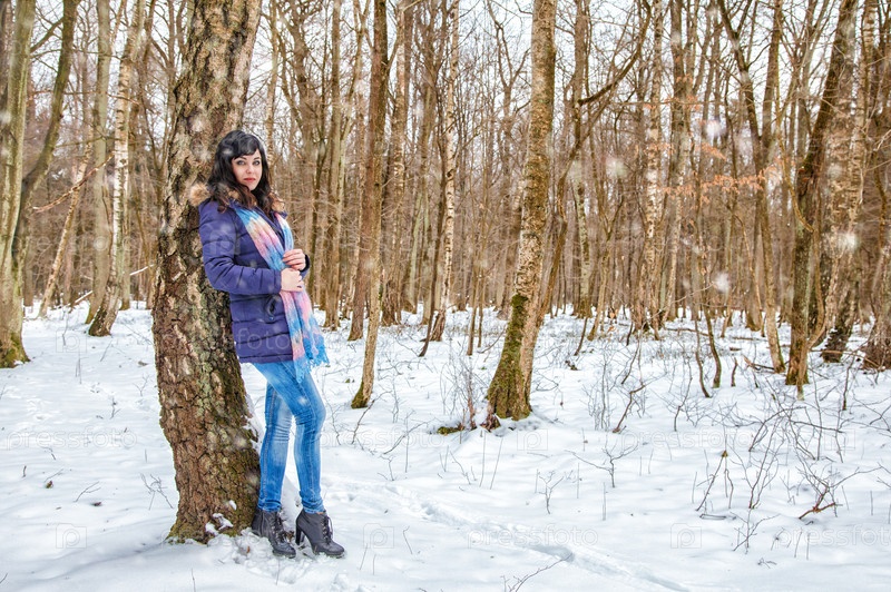 Молодая красивая женщина, идущая под снегопадом