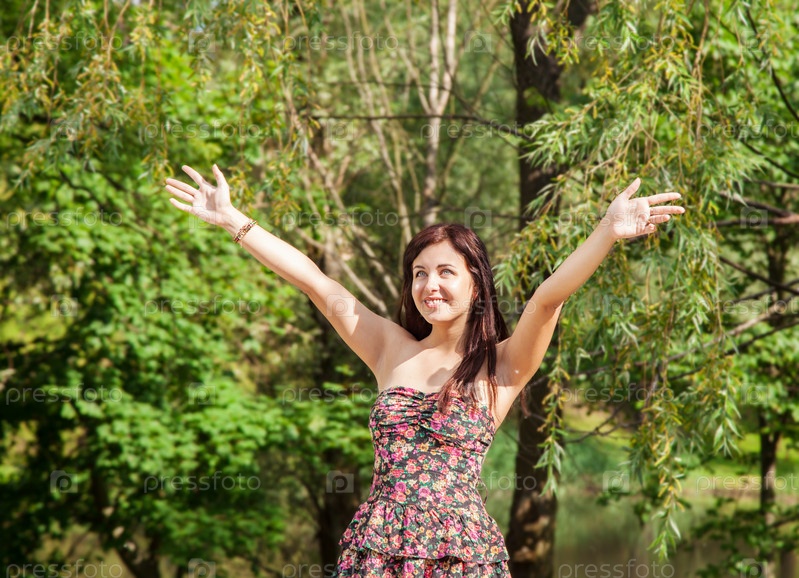 Молодая красивая улыбающаяся девушка протягивает руки к небу