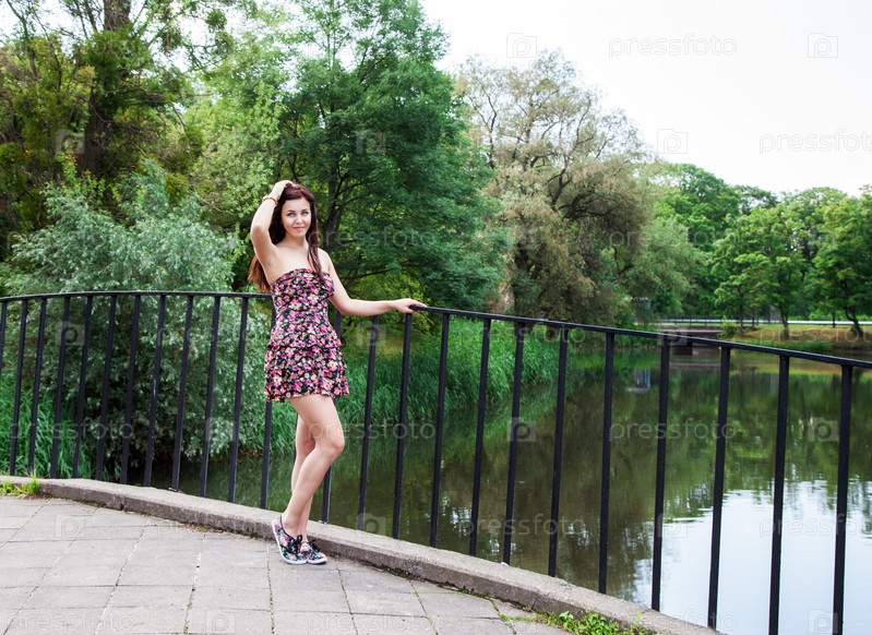 Красивая брюнетка стоит на мосту у реки
