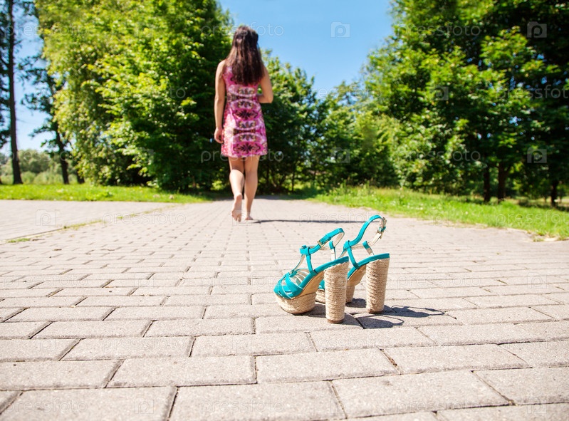 Обувь стоит на тротуаре, а женщина уходит