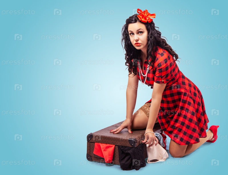 Молодая женщина сидит на полу и кладет одежду в чемодан