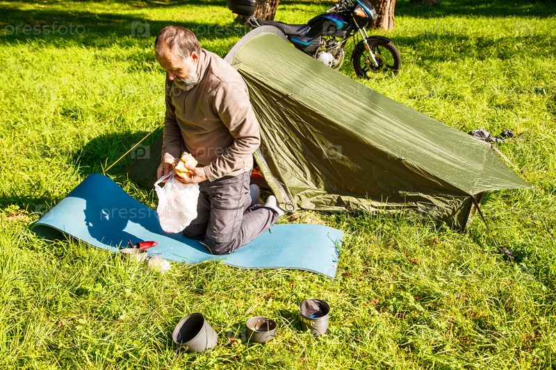 Пожилой турист готовит завтрак