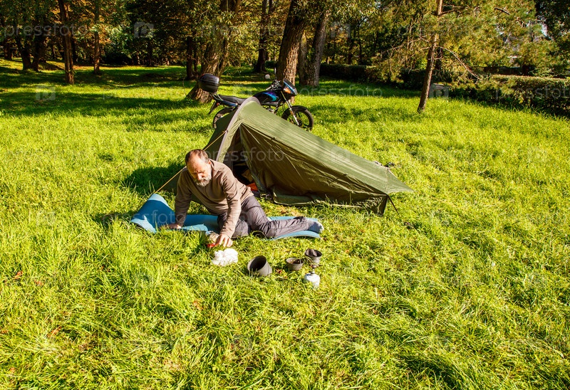 Пожилой турист отдыхает возле своей палатки