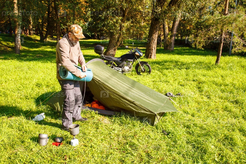 Пожилой турист складывает палатку в лесу