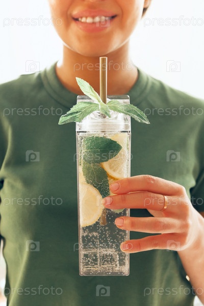 Урожайная женщина со свежим витаминным напитком