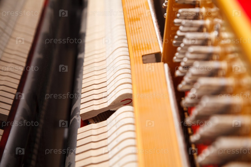 Новое пианино с открытыми струнами в помещении крупным планом