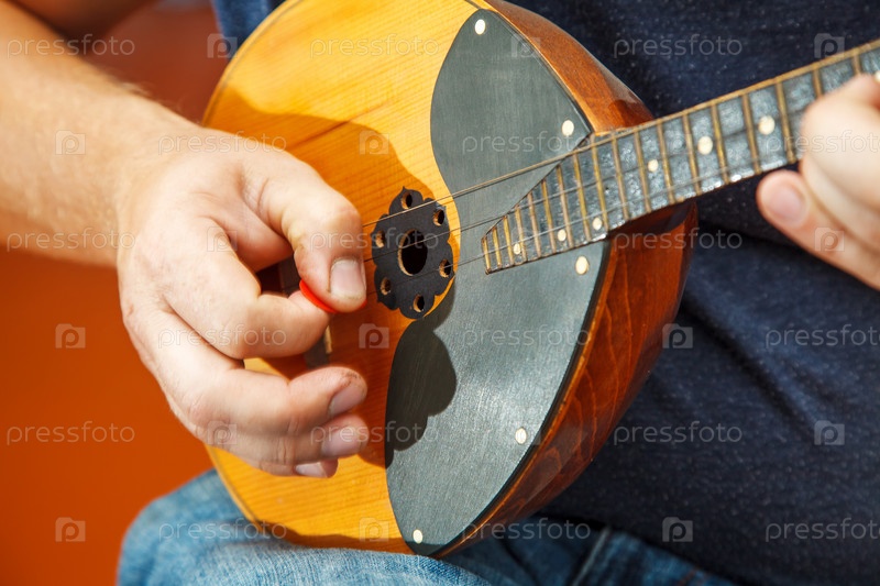 Мужчина играет на мандолине. руки крупным планом