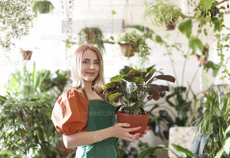 Женщина ухаживает за зелеными растениями в магазине