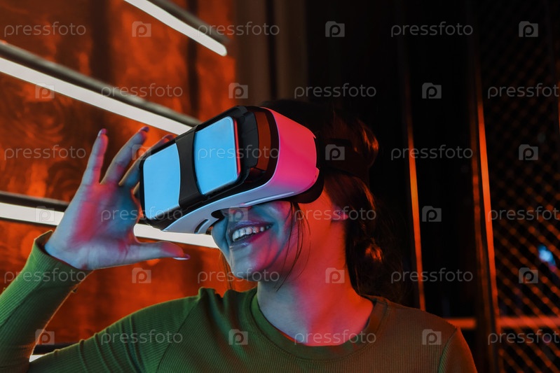 Веселая женщина в очках VR под неоновым светом