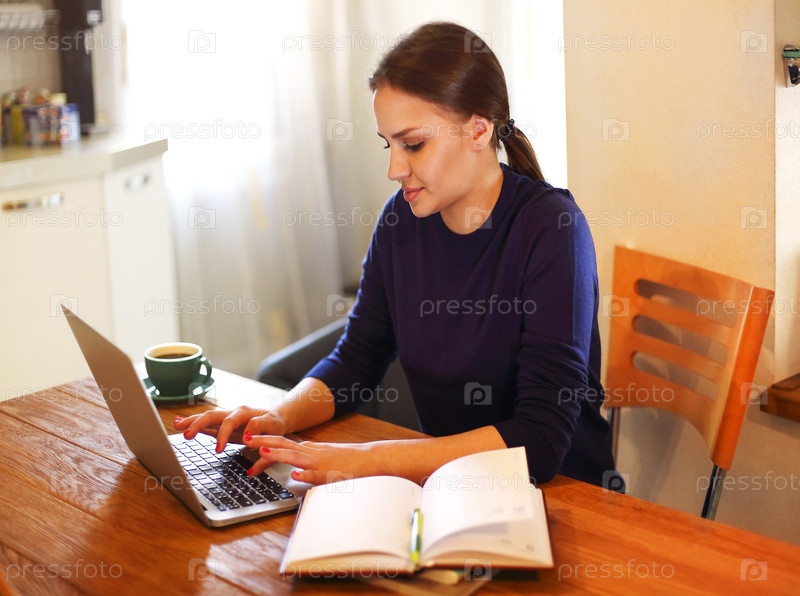Брюнетка с ноутбуком работает дома