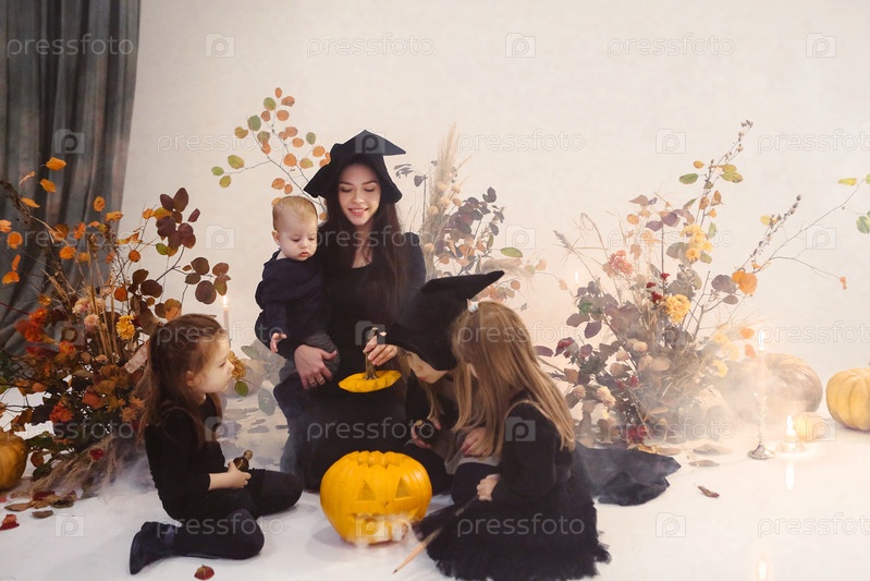 Очаровательная женщина и дети в костюмах на Хэллоуин