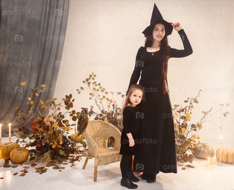 Очаровательная женщина и девушка в костюмах на Хэллоуин