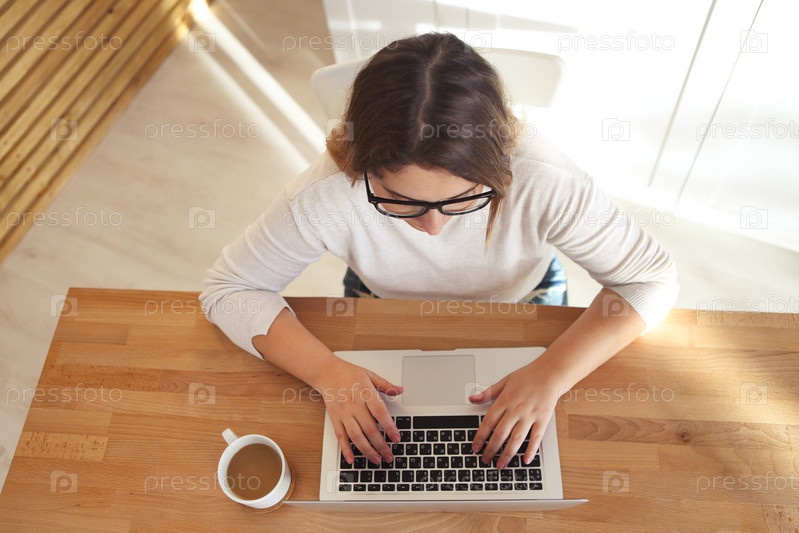 Вид сверху на женские руки, печатающие на клавиатуре ноутбука в очках и кофе на столе
