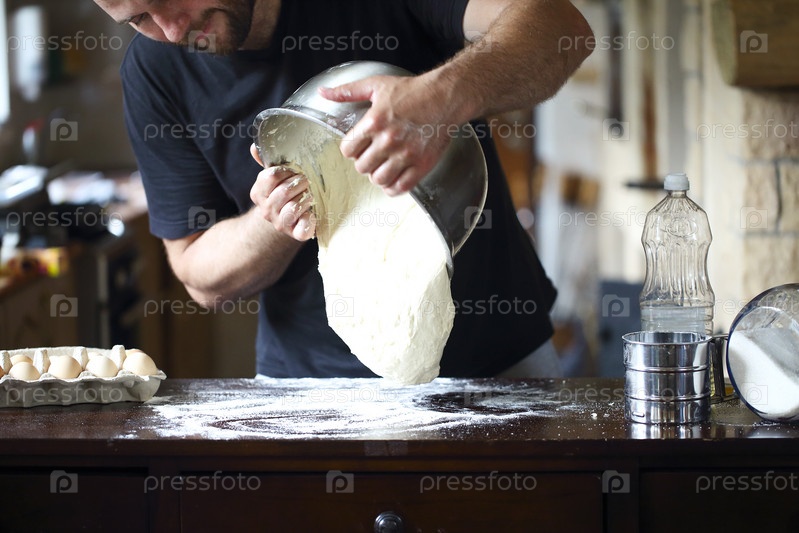 Мужские руки замешивают свежее тесто на кухонном столе