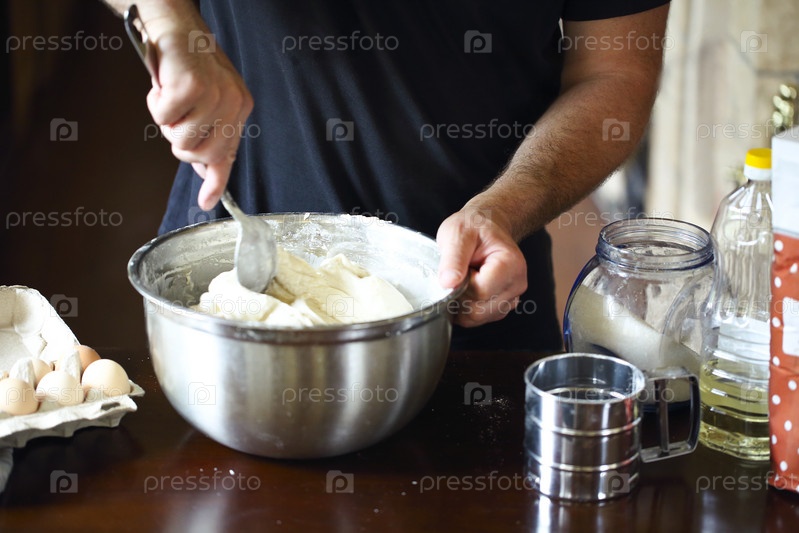 Мужские руки замешивают свежее тесто на кухонном столе