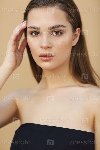 Красивая молодая женщина брюнет с чистой свежей кожей, касающейся собственных волос