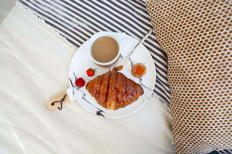 Завтрак с круассаном, кофе, клубникой и джемом на подносе в постели