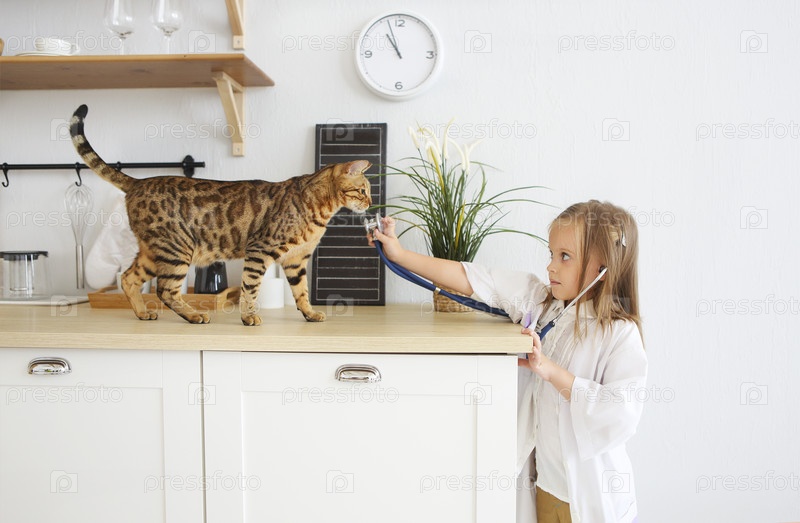 Маленькая девочка играет в ветеринара со своим котенком на кухне