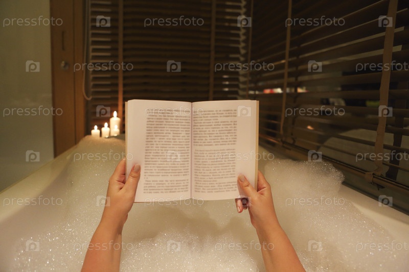 Молодая женщина читает книгу в ванне с пеной и свечами
