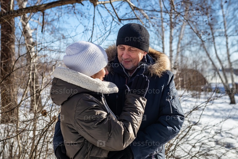 Образ жизни, портрет крупным планом. Пожилая пара обнимает друг друга и смотрит друг на друга в сельской местности на закате в зимнем лесу, семейные отношения
