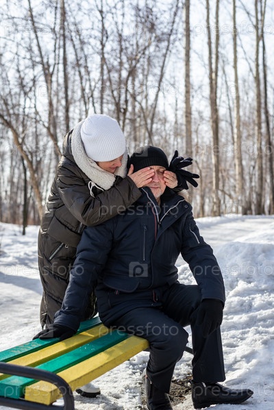 Пожилая женщина закрыла глаза на мужчину в возрасте, сидит на скамейке в зимнем лесу и парке, семейные отношения. Образ жизни