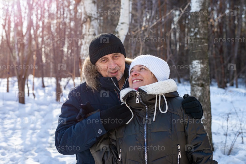 Образ жизни, портрет крупным планом. Пожилая пара обнимает друг друга в сельской местности в зимнем лесу, семейные отношения
