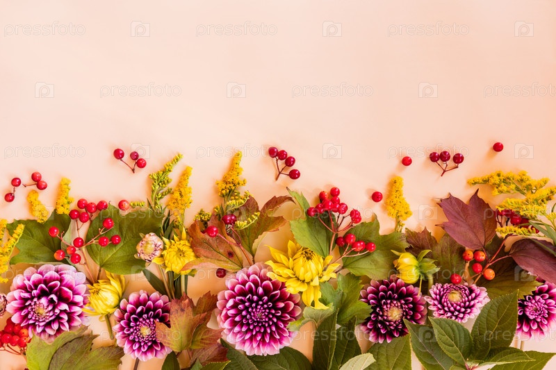 Яркая разноцветная кайма из осенних цветов и ягод на бежевом фоне. копия пространства. вид сверху. открытка. праздничный плакат