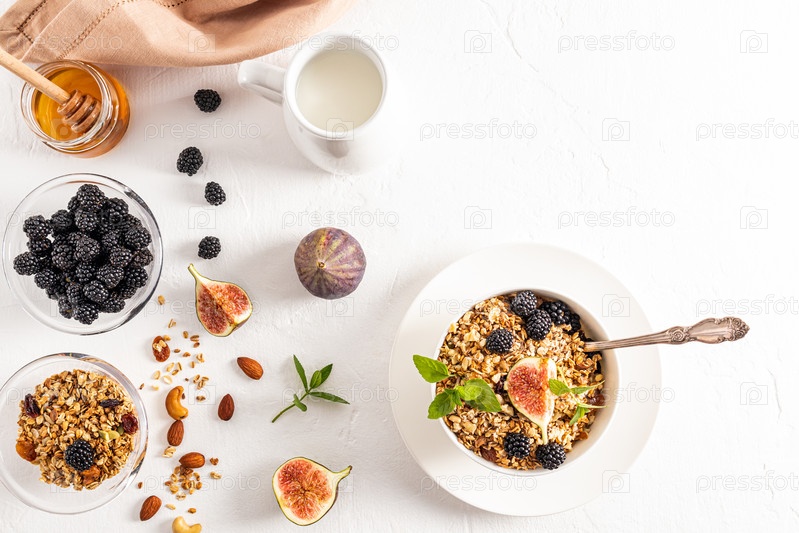 Вид сверху на миску со здоровым здоровым завтраком из мюсли или мюслей и ингредиентов для его приготовления. белый фон. Детокс