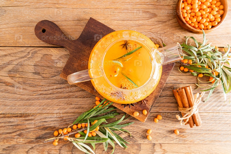 Вид сверху на стеклянный чайник с горячим традиционным осенним чаем из облепихи для укрепления здоровья. деревенский стиль