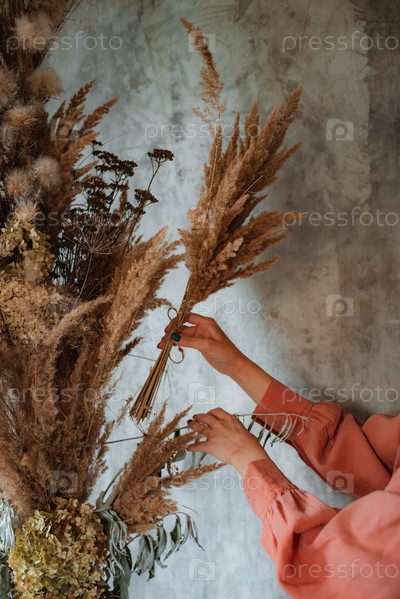 Женщина-флорист украшает вечный букет из сухоцветов на прилавке в своей цветочной студии. Такая женщина-предприниматель, которая составляет букет из сухоцветов