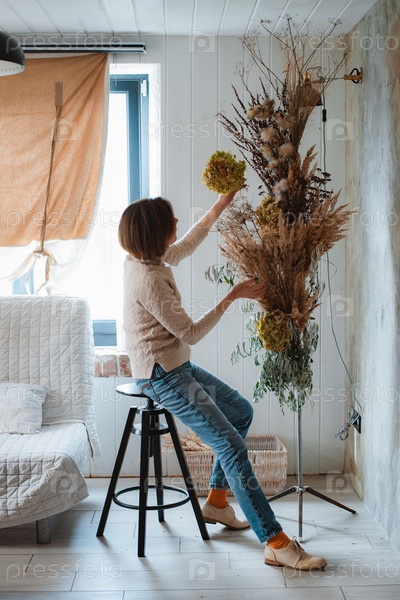 Женщина-флорист украшает вечный букет из сухоцветов на прилавке в своей цветочной студии. Такая женщина-предприниматель, которая составляет букет из сухоцветов