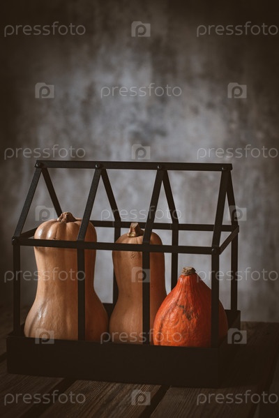 Натюрморт с тыквой в декоративном домике-клетке на Хэллоуин в стиле минимализма на фоне темной бетонной стены. Осенняя композиция на День благодарения