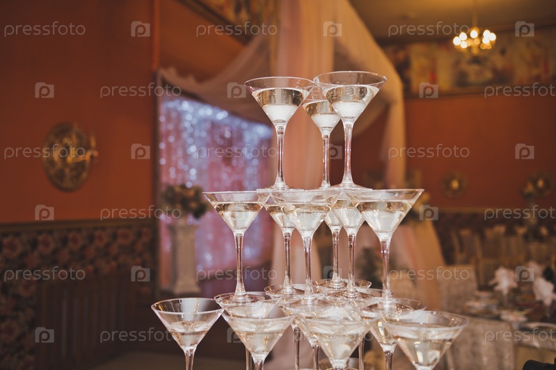 Пирамида из бокалов для шампанского на фоне праздничного зала