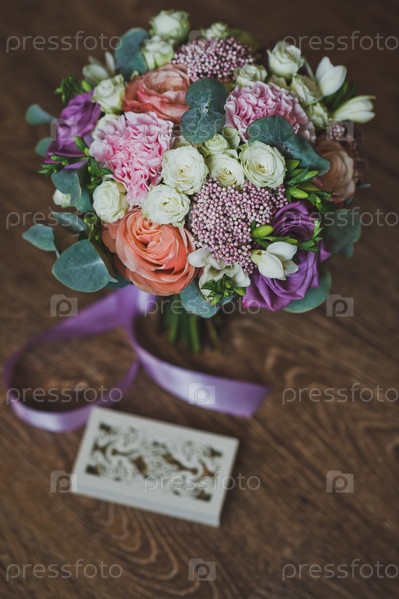 Обручальные кольца в красивой резной шкатулке и красочный букет