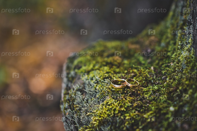 Обручальные кольца на зеленом мху на корнях деревьев