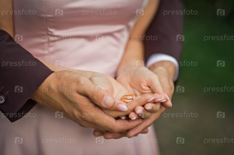 Золотые обручальные кольца на ладонях жениха и невесты