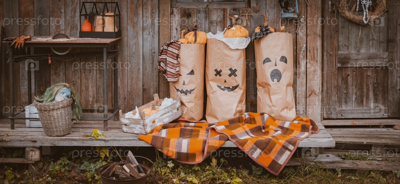 Фотозона на Хэллоуин с праздничной атрибутикой ручной работы. Пакеты из крафт-бумаги, расписанные гримасой тыквы Джека, украшения монстров на Хэллоуин
