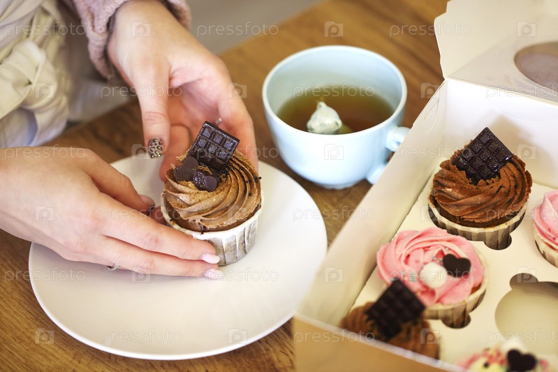 Женщина с кексом и чашкой чая дома