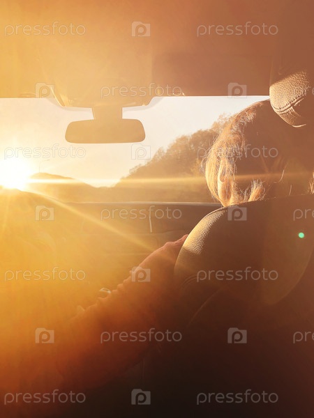 Женщина в машине на закате