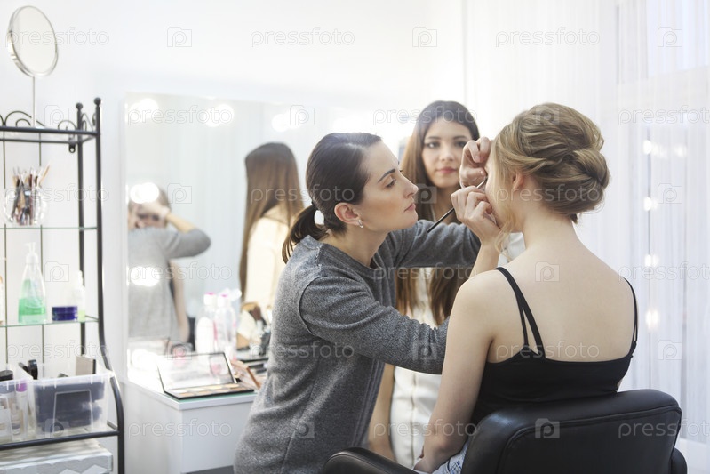 Учитель макияжа со своей ученицей. Урок макияжа в школе красоты. Визажист работает в своей студии