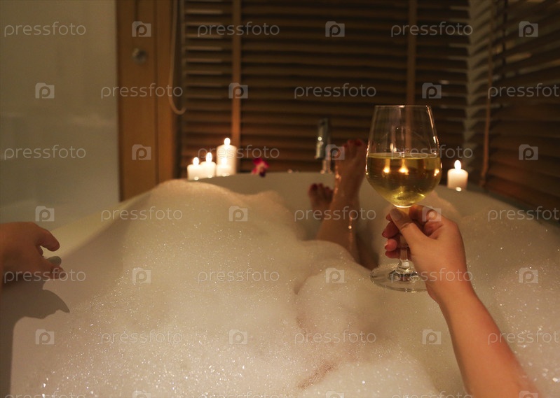 Молодая женщина пьет белое вино в ванне с пеной и свечами